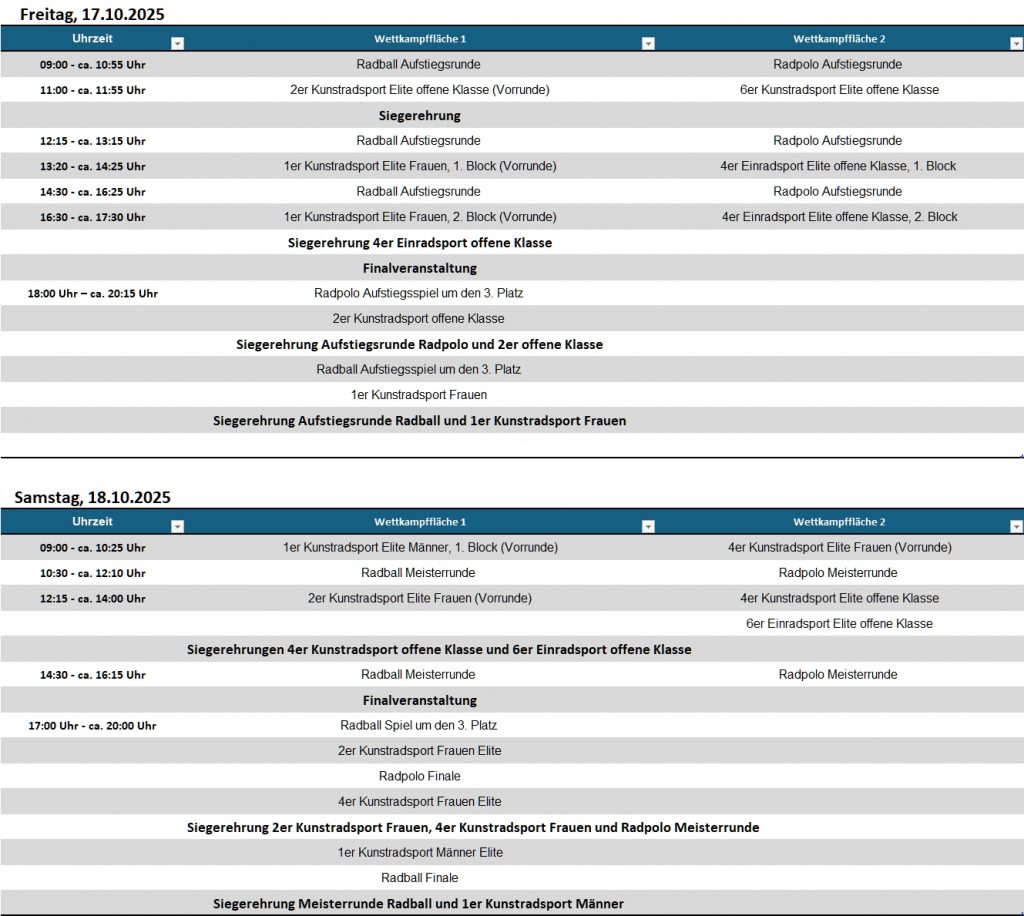 Hier der aktuelle Zeitplan der Deutschen Meisterschaft. Weitere Infos sind unter Tunier / Download-Center abrufbar. Hier der direkte Link zum Programm incl. Zeitplan: Hier der Link zum Programmheft:https://hallenradsport-dm2025.de/wp-content/uploads/2025/10/Programmheft-DM-2025.pdf