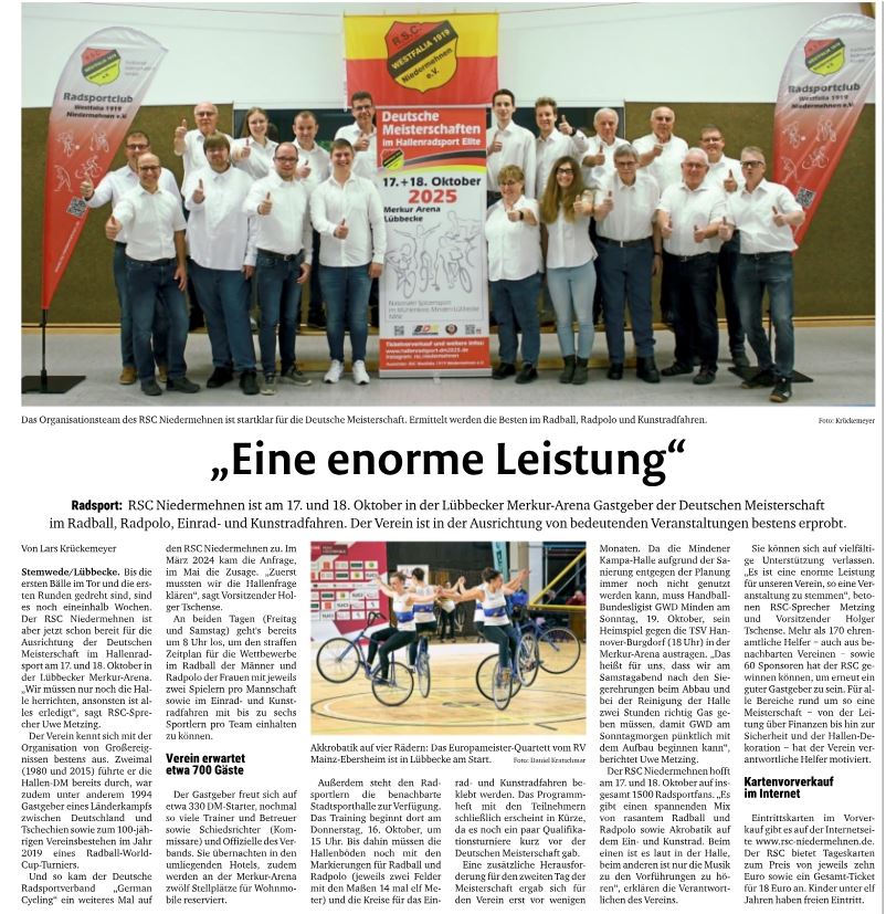 Foto: RSC-Niedermehnen Übergabe der Freikarten zur Deutschen Meisterschaft 2025 im Hallenradsport Heute war es so weit: Die feierliche Übergabe der Freikarten zur Deutschen Meisterschaft im Hallenradsport 2025 fand statt. Anlass war ein Preisausschreiben, das im Rahmen des beliebten Stemweder Markts durchgeführt wurde. Im Mittelpunkt des Gewinnspiels stand eine knifflige Schätzfrage:„Wie viele Speichen sind 2024 beim…