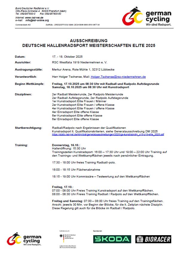 Hier der aktuelle Zeitplan der Deutschen Meisterschaft. Weitere Infos sind unter Tunier / Download-Center abrufbar. Hier der direkte Link zum Programm incl. Zeitplan: Hier der Link zum Programmheft:https://hallenradsport-dm2025.de/wp-content/uploads/2025/10/Programmheft-DM-2025.pdf