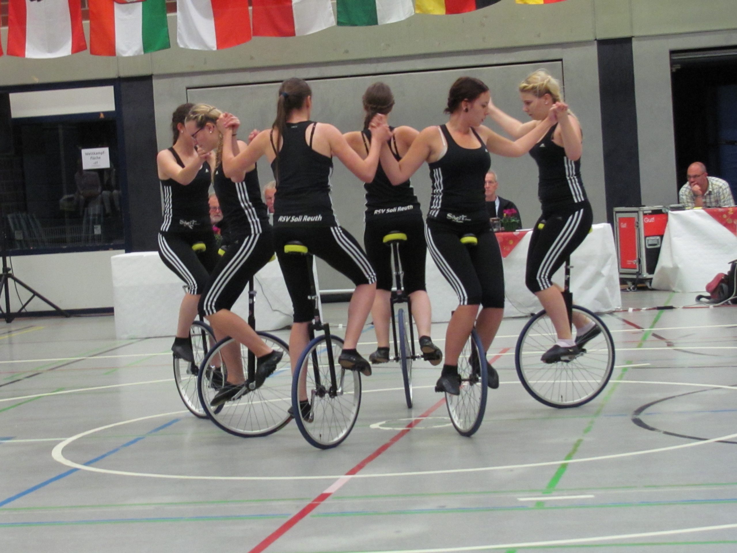 Im 4er-Einradfahren kommen die Favoritinnen aus dem Hegau (Südbaden). Der RMSV „Edelweiß“ Aach, seit Jahrzehnten der erfolgreichste deutsche Hallenradsport-Verein, prägt diese Disziplin wie kein anderer. Schon in der Vorrunde des Bundespokals unterstrichen die amtierenden Deutschen Meisterinnen ihre Dominanz und stellten mit 149,95 Punkten einen neuen nationalen Rekord auf. Im Finale feierte der Verein dann sogar einen Dreifachsieg: Das Meisterinnen-Team gewann zum vierten Mal in Folge, während das letztjährige Juniorinnen-Quartett Platz zwei belegte – knapp vor der zweiten Aacher Frauenmannschaft. Medaillen-Chancen haben auch der RC Oberesslingen und die TSG Flonheim, das Quartett, dass mit den höchsten Schwierigkeitspunkten an den Start geht.